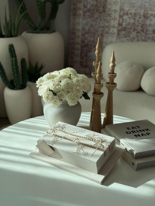 A wooden box covered in embroidered fabric. Box dimensions: 30 x 17 cm, height: 7 cm. Base dimensions: 37 x 24 cm.