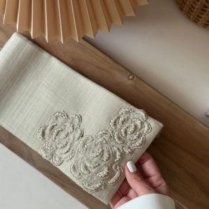 • ظرف قماش أوف وايت مطرز بالورد باللون الأوف وايت