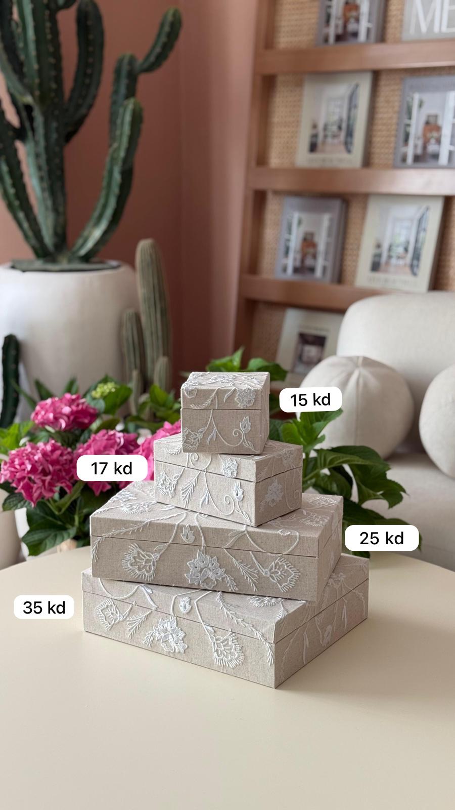 كمية علبة قماش لنن بيج بتطريز ورد أوف وايت حجم كبير